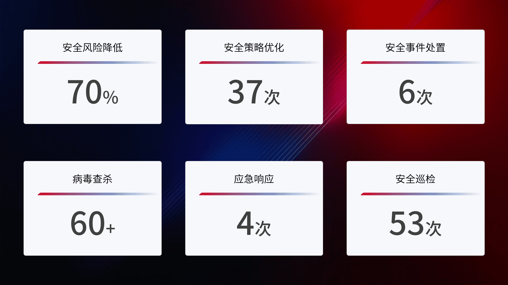 提供全面的安全事件报告体系,,,,包括处置报告、、、、周报、、、、季度和年度总结,,,结合持续监控,,帮助客户深入了解网络安全状况。。