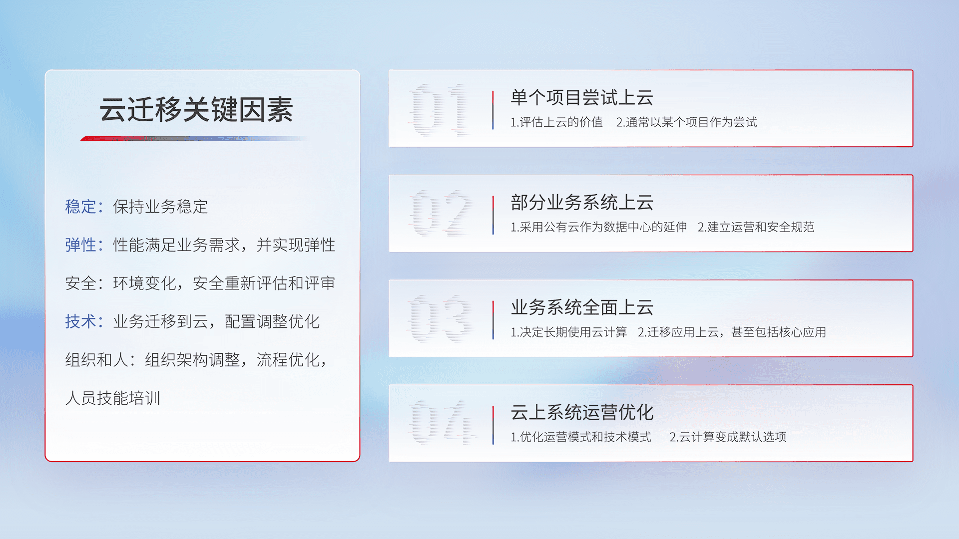 结合实际业务,,,从规划设计、、、云平台选型、、、、云原生改造、、数据迁移、、、集成交付,,,迁移全过程为客户识别最佳上云路径,,,做好风险识别管理,,,设计网络架构、、、、身份权限、、安全审计合规、、、操作审计、、、、日志审计、、、监控告警策略、、、多站点容灾设计等,,,对云上基础设施进行整体规划,,提升IT治理水平,,,,以满足弹性、、、高可用、、、、高性能的需求。。