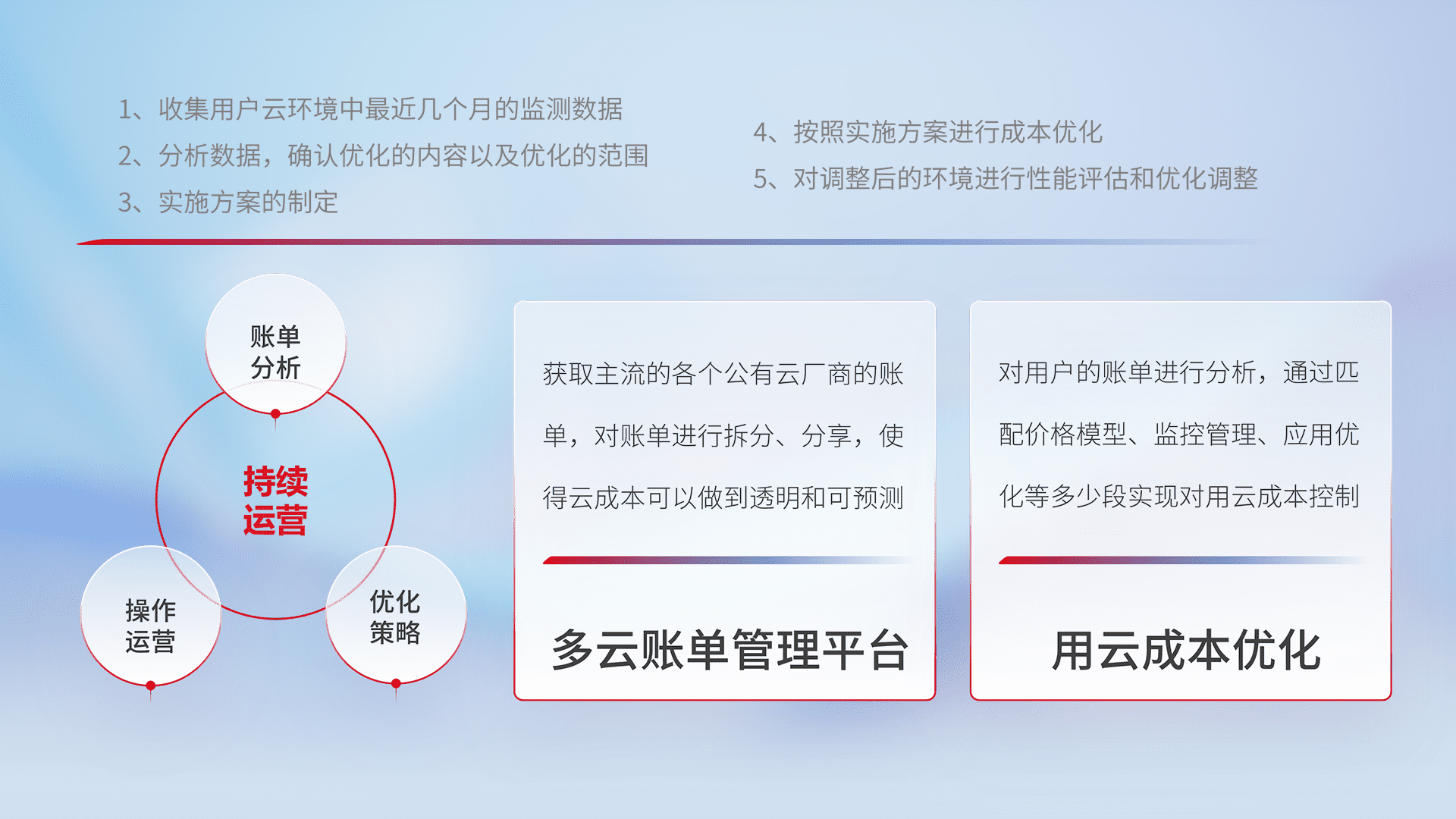 通过多云纳管,,,以统一的资源数据模型把客户的云资源进行抽象和封装,,进而实现对多云资源的统一操作,,,,保障云资源管理的可靠性、、稳定性与可用性。。。量身定制化运维内容,,,,配置、、、、开发运维、、补丁管理、、备份、、监控、、认证和访问管理、、审计和日常巡检等,,,保障在用云过程中的可靠度,,稳定度以及高可用率。。。
